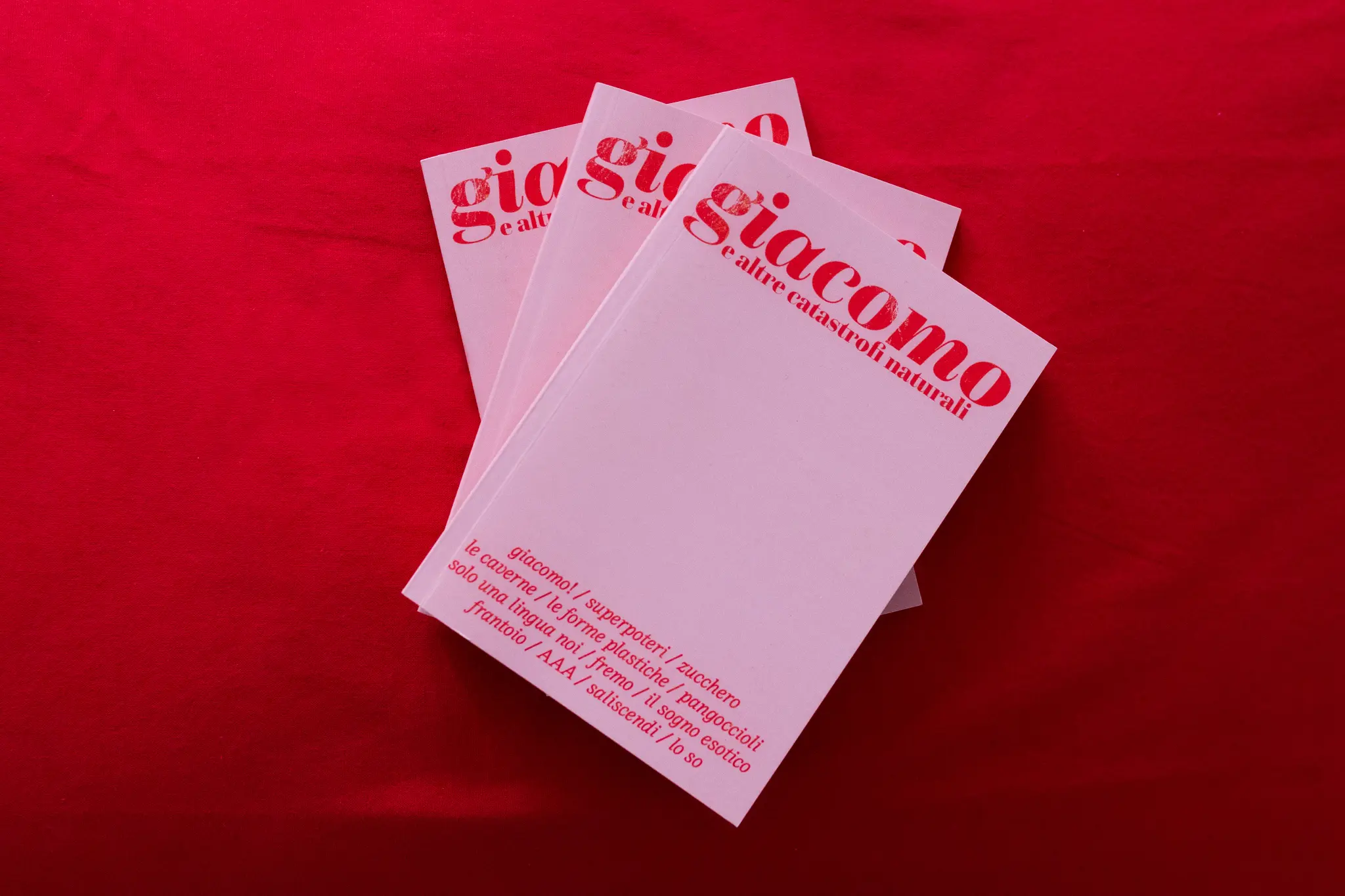 giacomo is a short poetic collection, an editorial project realised together with Laura Guarnier and Caterina Rossi. giacomo is the story of a love cataclysm: the theme of the collection is not love itself, but falling in love, the carousel of infatuations, fleeting and calamitic attachments.
