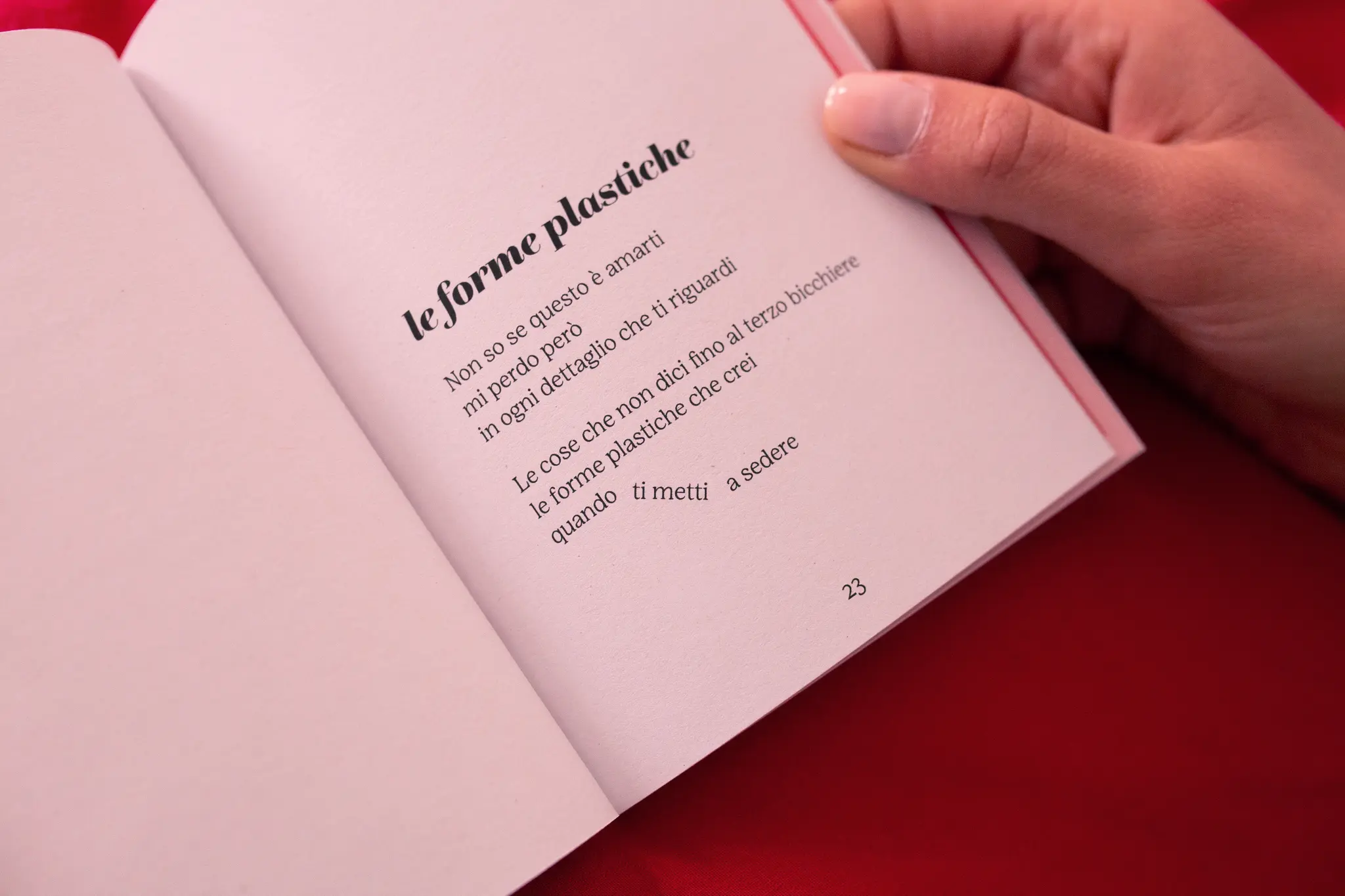 The book is in A6 format, the colour palette uses a combination of pink and red, which are also used to treat the photos in duotone in the pages inside. The images represent various natural disasters (such as the high water in Venice, a landslide, a hurricane and a volcanic eruption) and are placed in analogy with the various emotions and phases that those that are in love go through. The poems are laid out in a non-linear way, so as to reflect the emotions that are the protagonists.