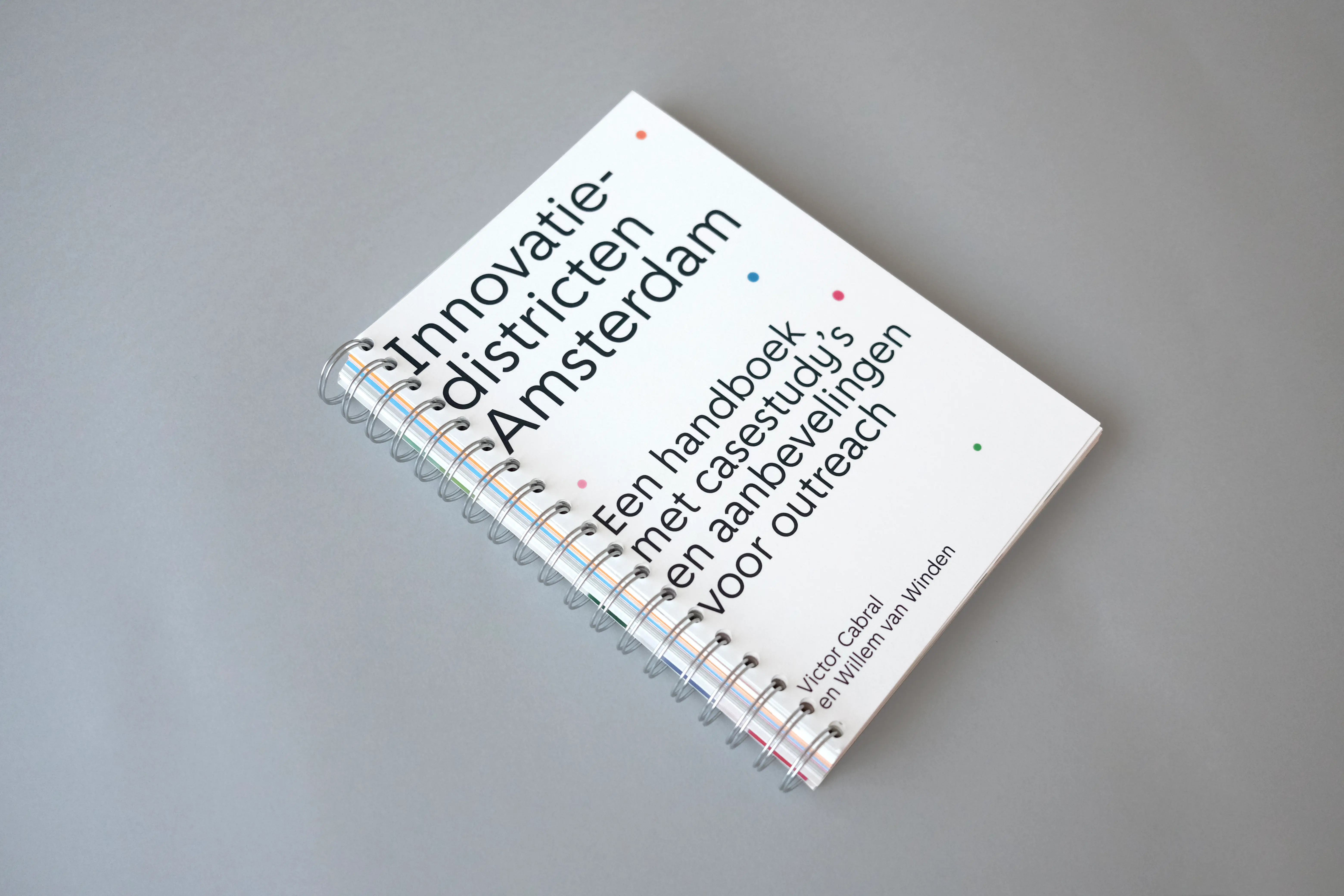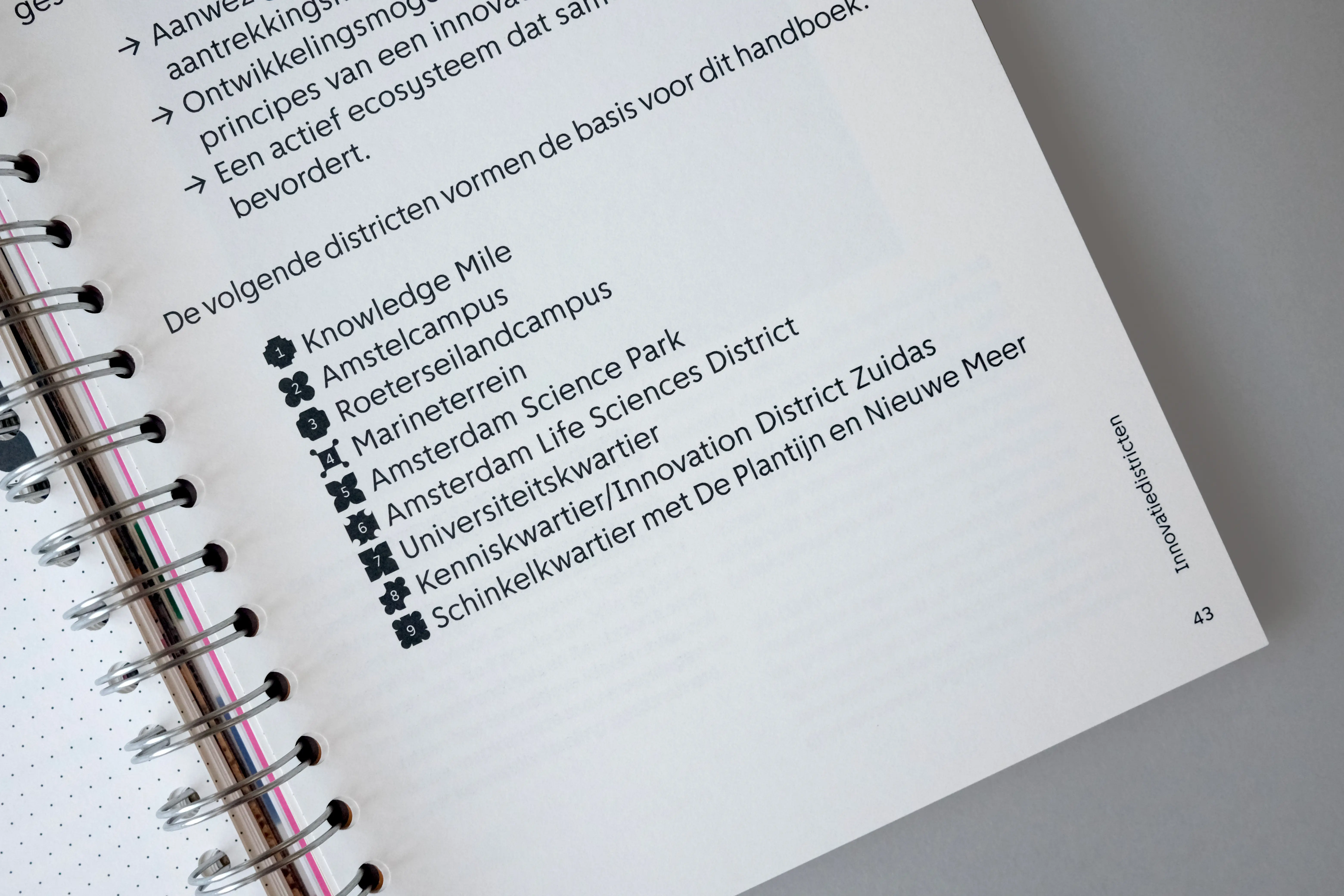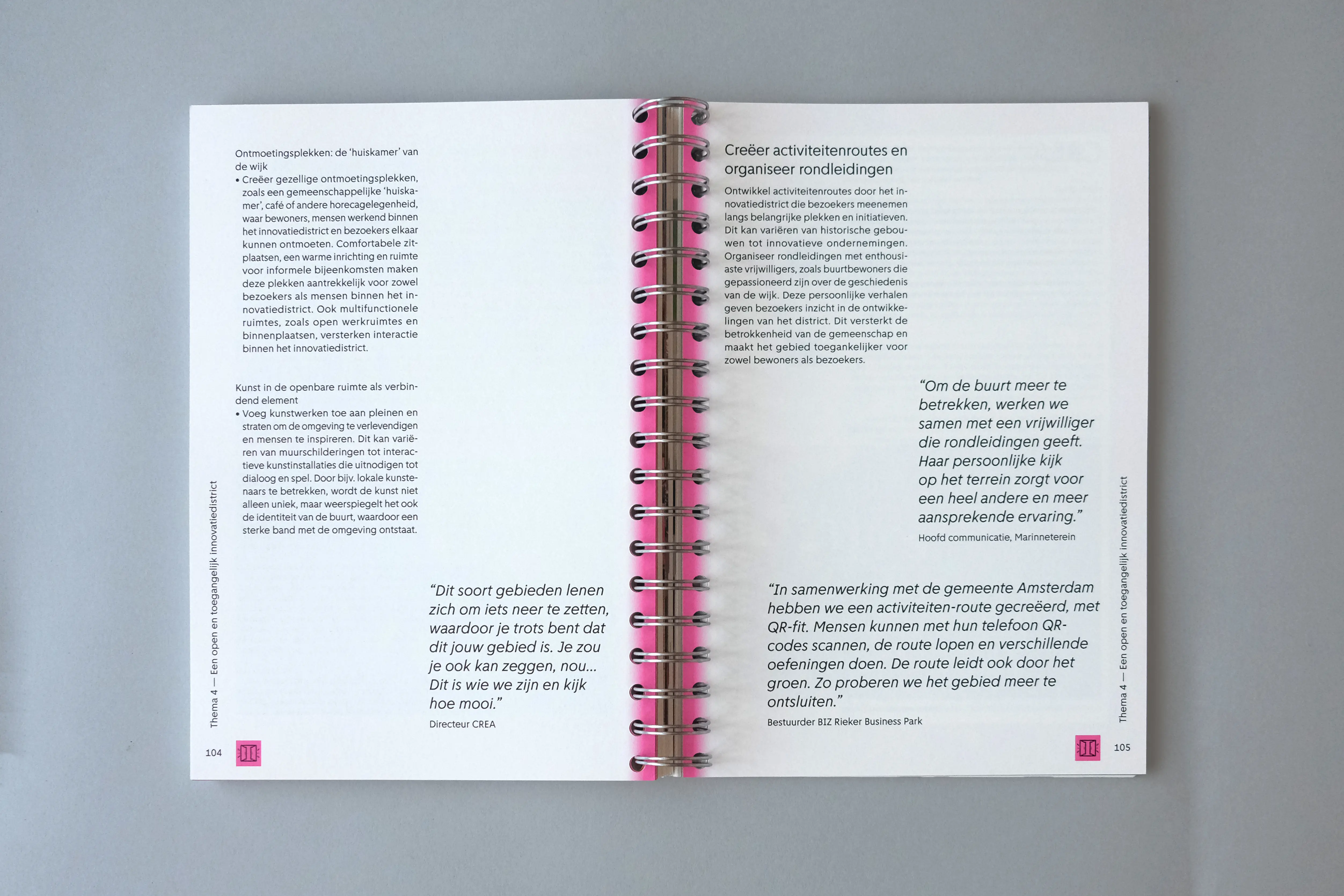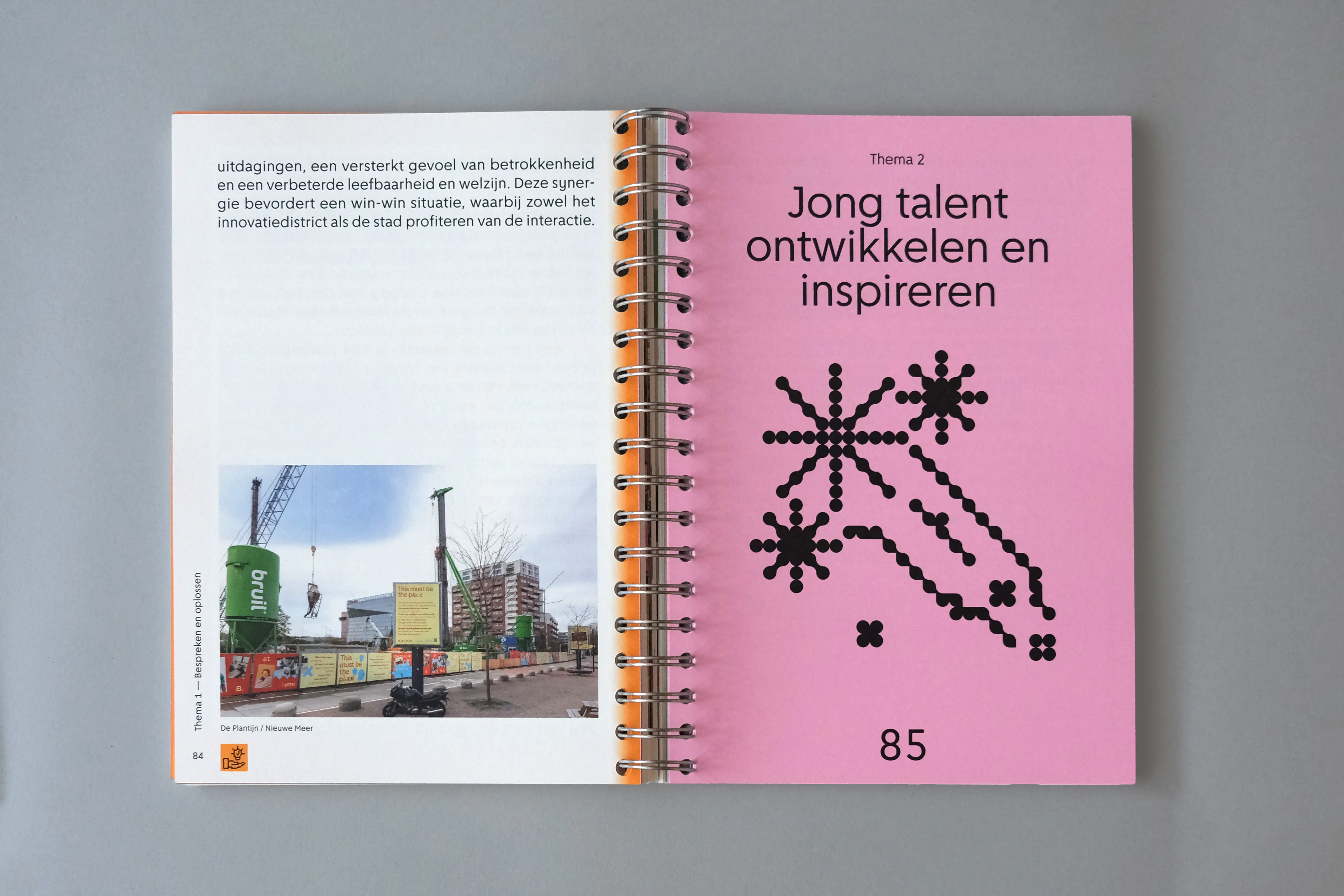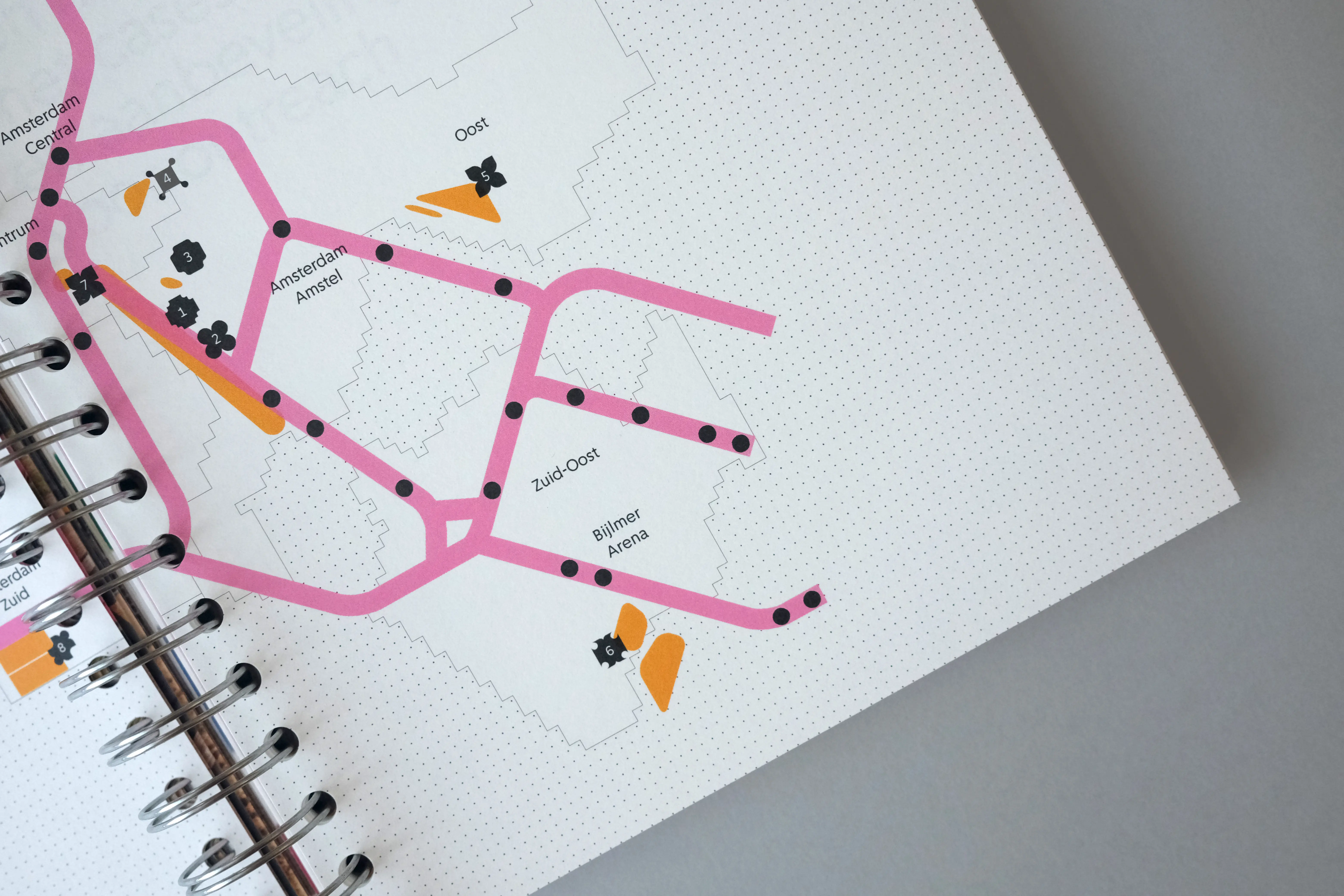 The grid acts as a recurring visual framework. From decorative chapter openings, it evolves into a more defined structure (consisting of overlapping circles and squares) used to design icons that visually summarize each theme. Every topic is assigned a specific color, and case studies are marked by a matching colored frame. We worked with a single typeface, Amsterdam Sans, reflecting the book’s focus on the city and its people. The manual-like feeling of the project informed our material choices, leading to the use of spiral binding.