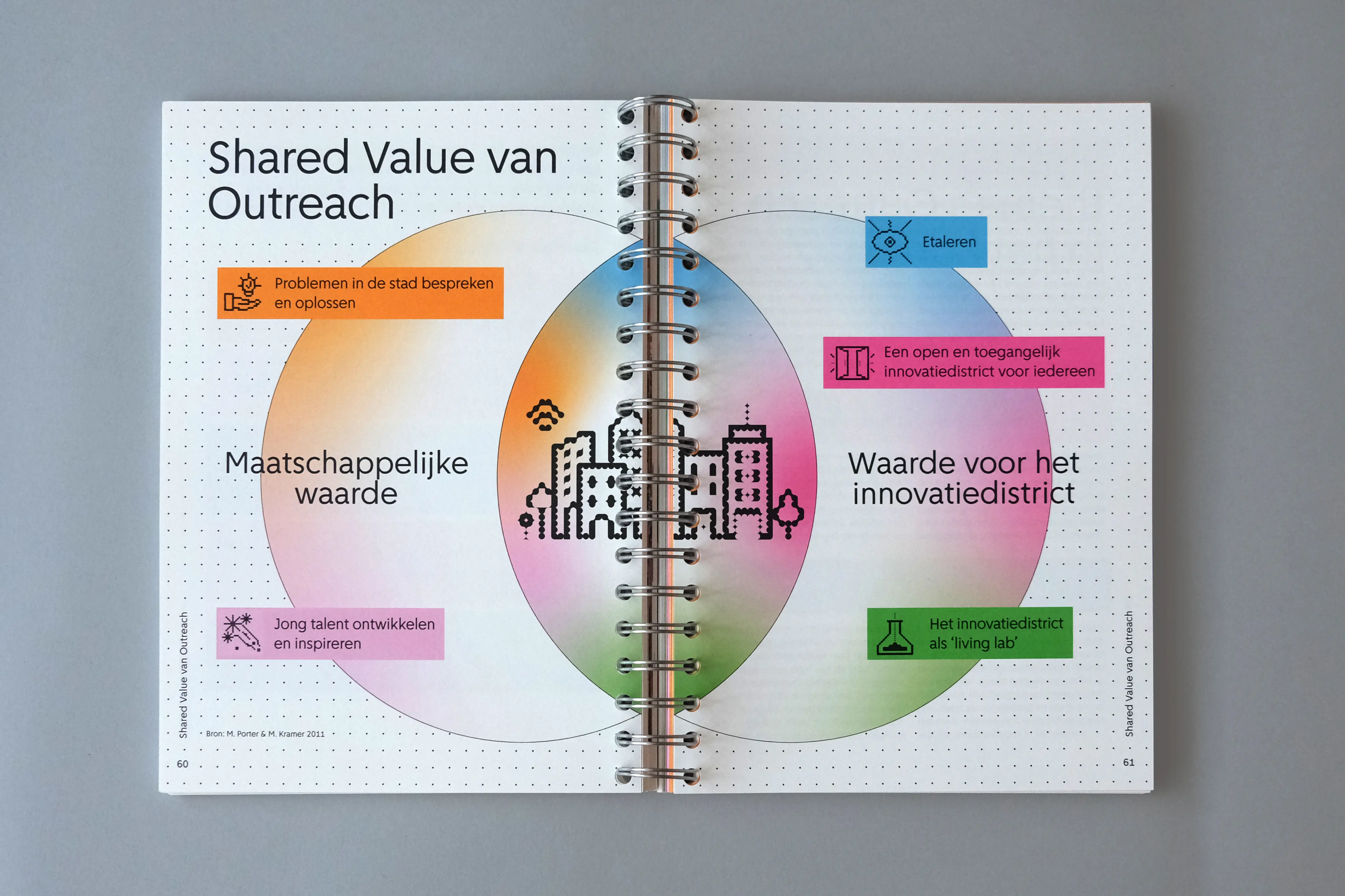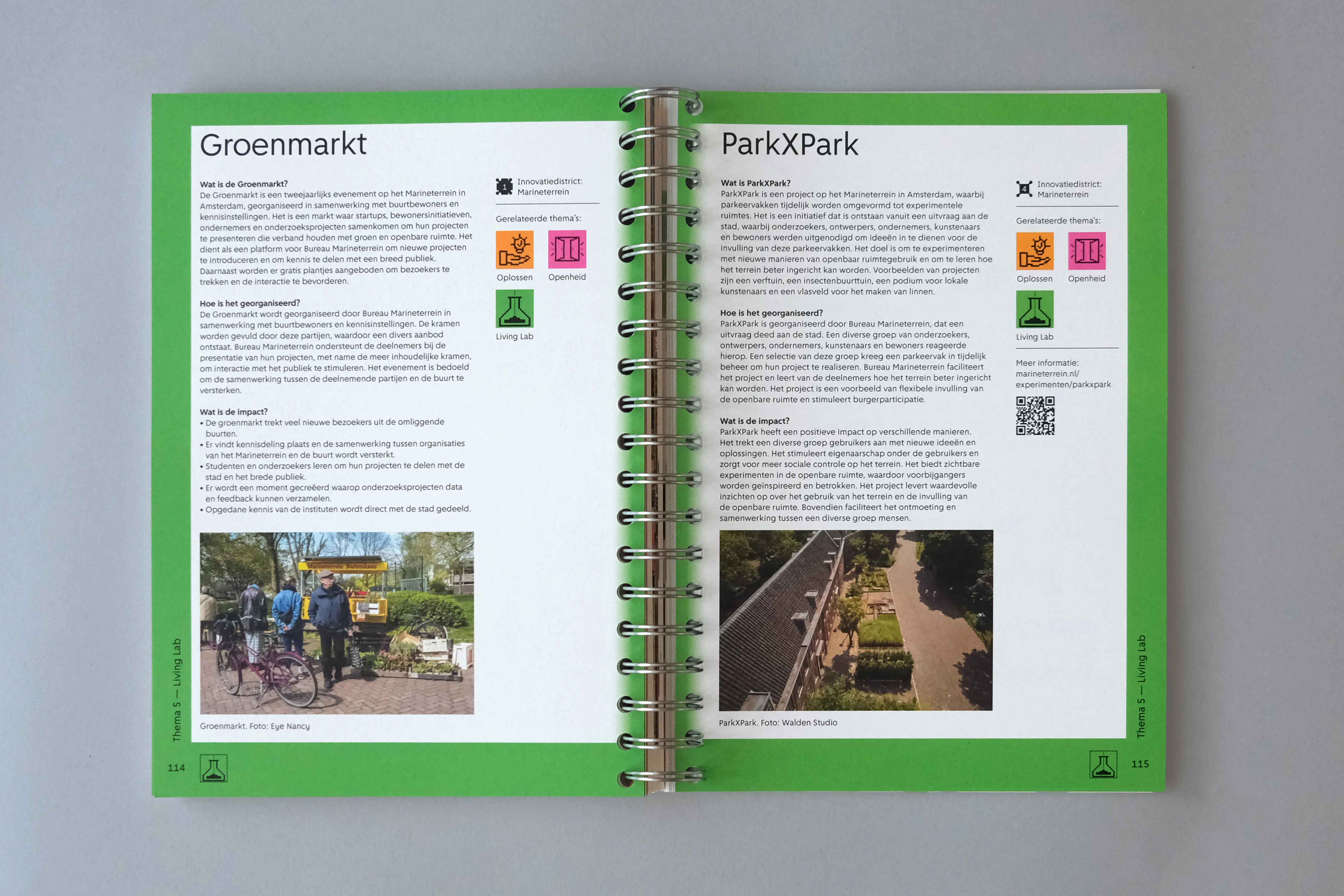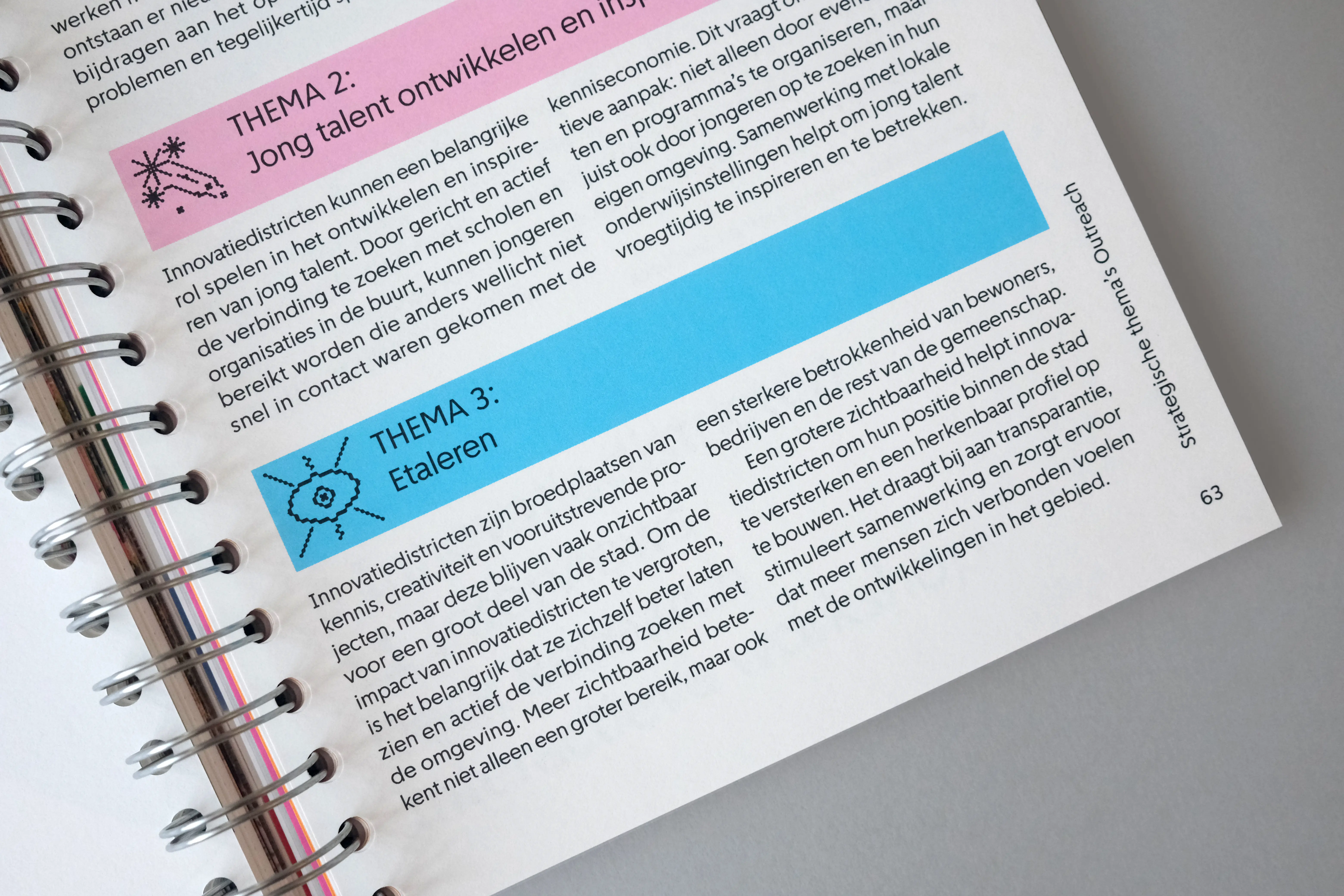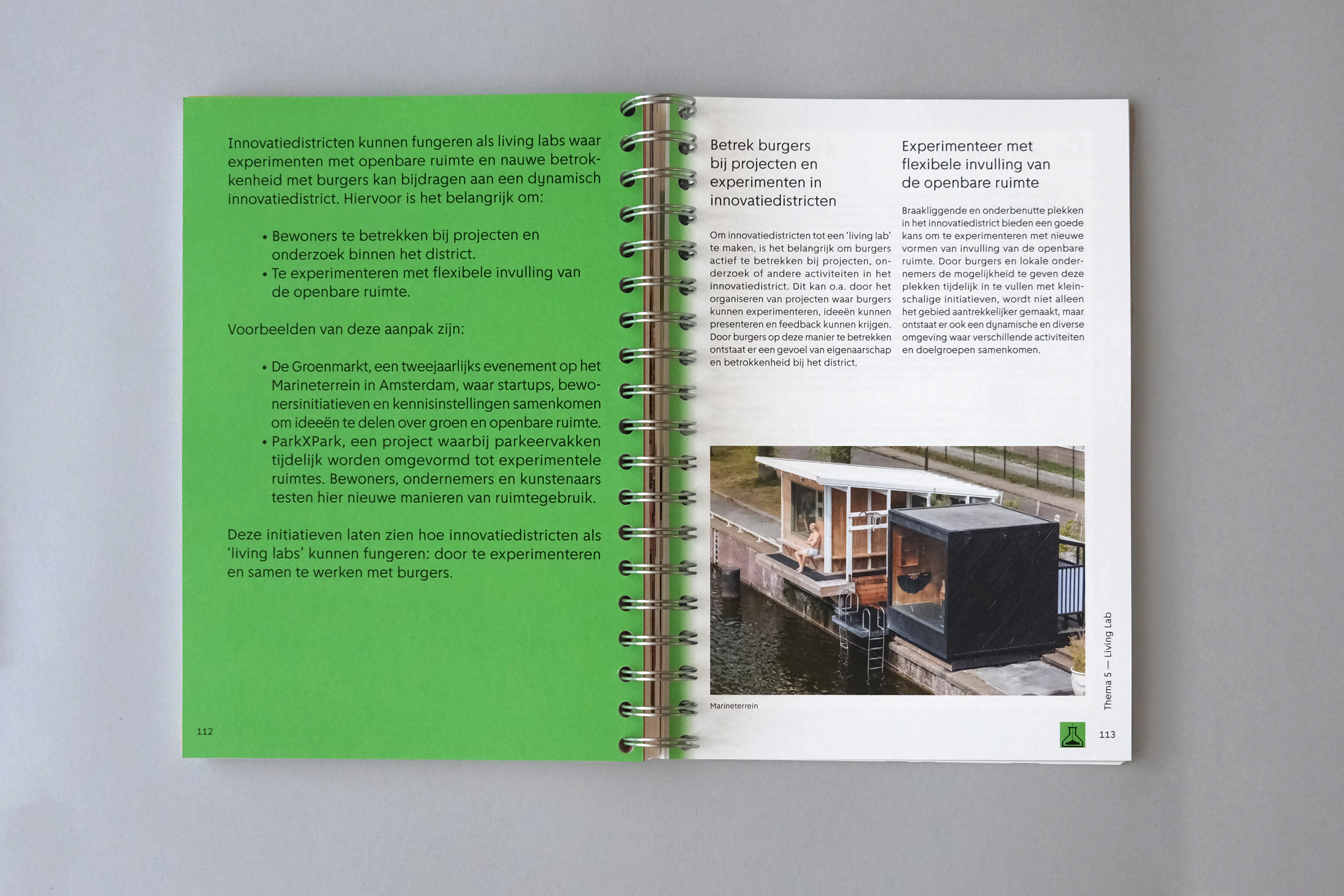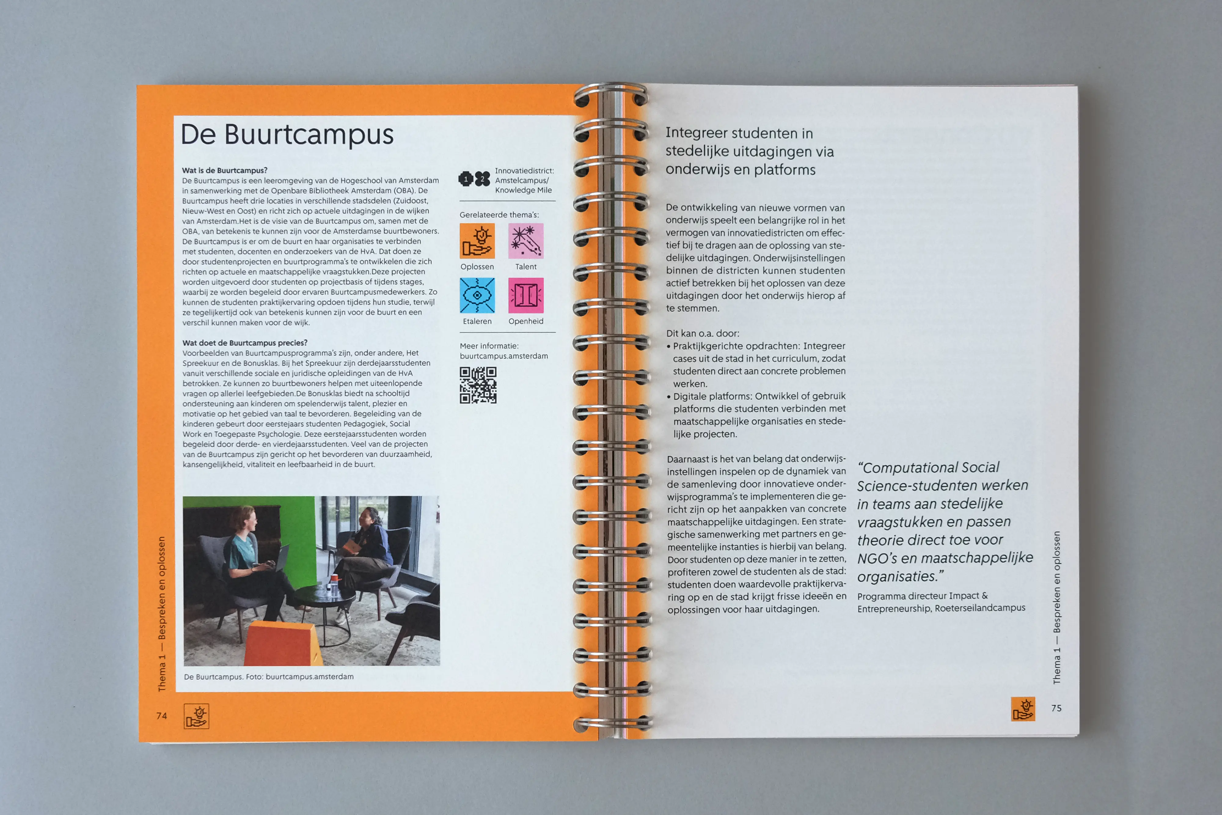 The grid acts as a recurring visual framework. From decorative chapter openings, it evolves into a more defined structure (consisting of overlapping circles and squares) used to design icons that visually summarize each theme. Every topic is assigned a specific color, and case studies are marked by a matching colored frame. We worked with a single typeface, Amsterdam Sans, reflecting the book’s focus on the city and its people. The manual-like feeling of the project informed our material choices, leading to the use of spiral binding.