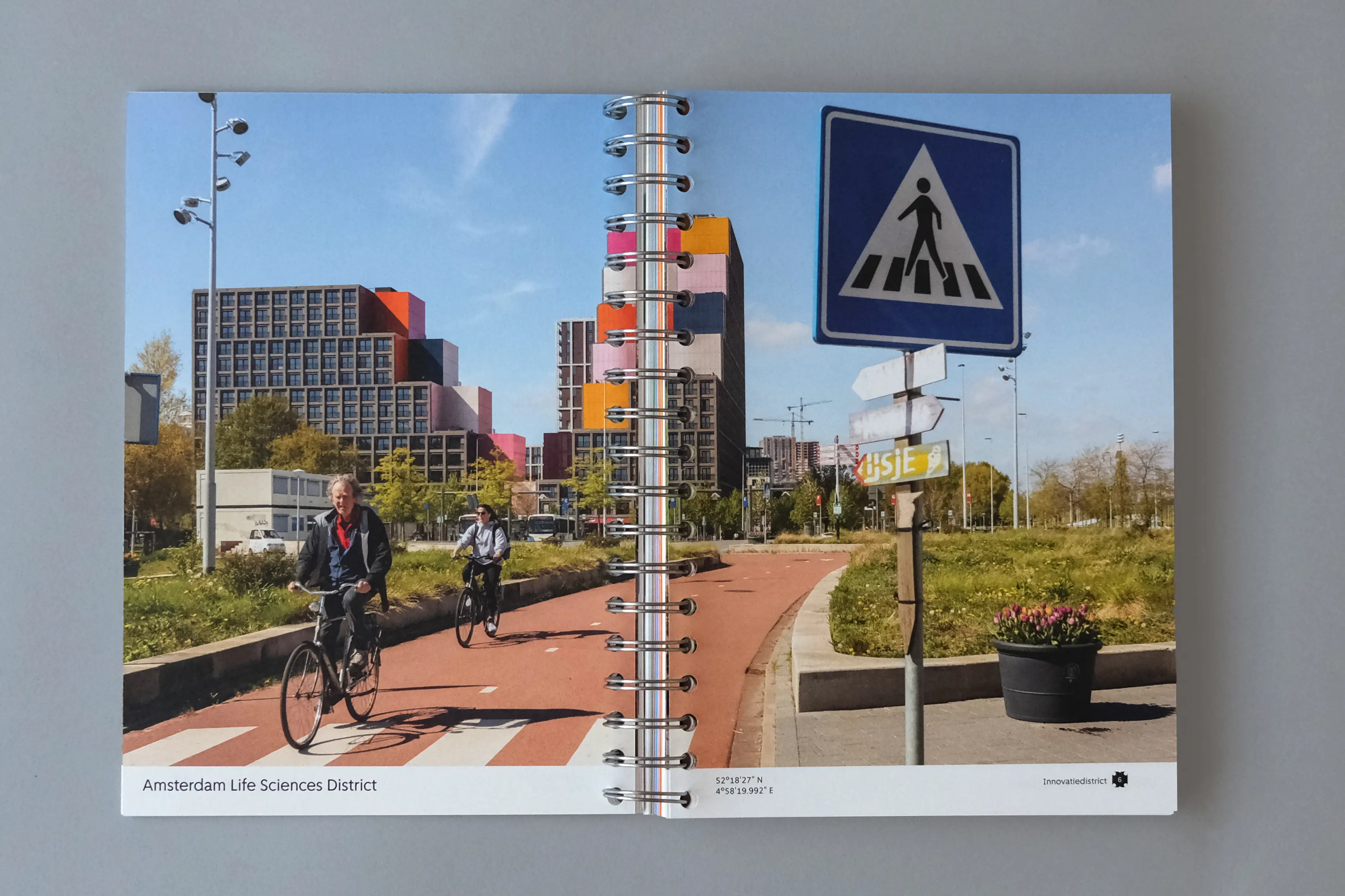 Since the districts of Amsterdam are central to our research, integrating photography was essential. We collaborated with the photographer Marlise Steeman for her documentary approach, attention to detail and ability to portray everyday life with honesty. Each district is first introduced with a full-spread photograph, and later revisited through a smaller image accompanied by brief contextual information. The two images reveal different perspectives: the first presents a wider view of the district and its inhabitants, while the second highlights an architectural detail or a more intimate aspect of the same place.