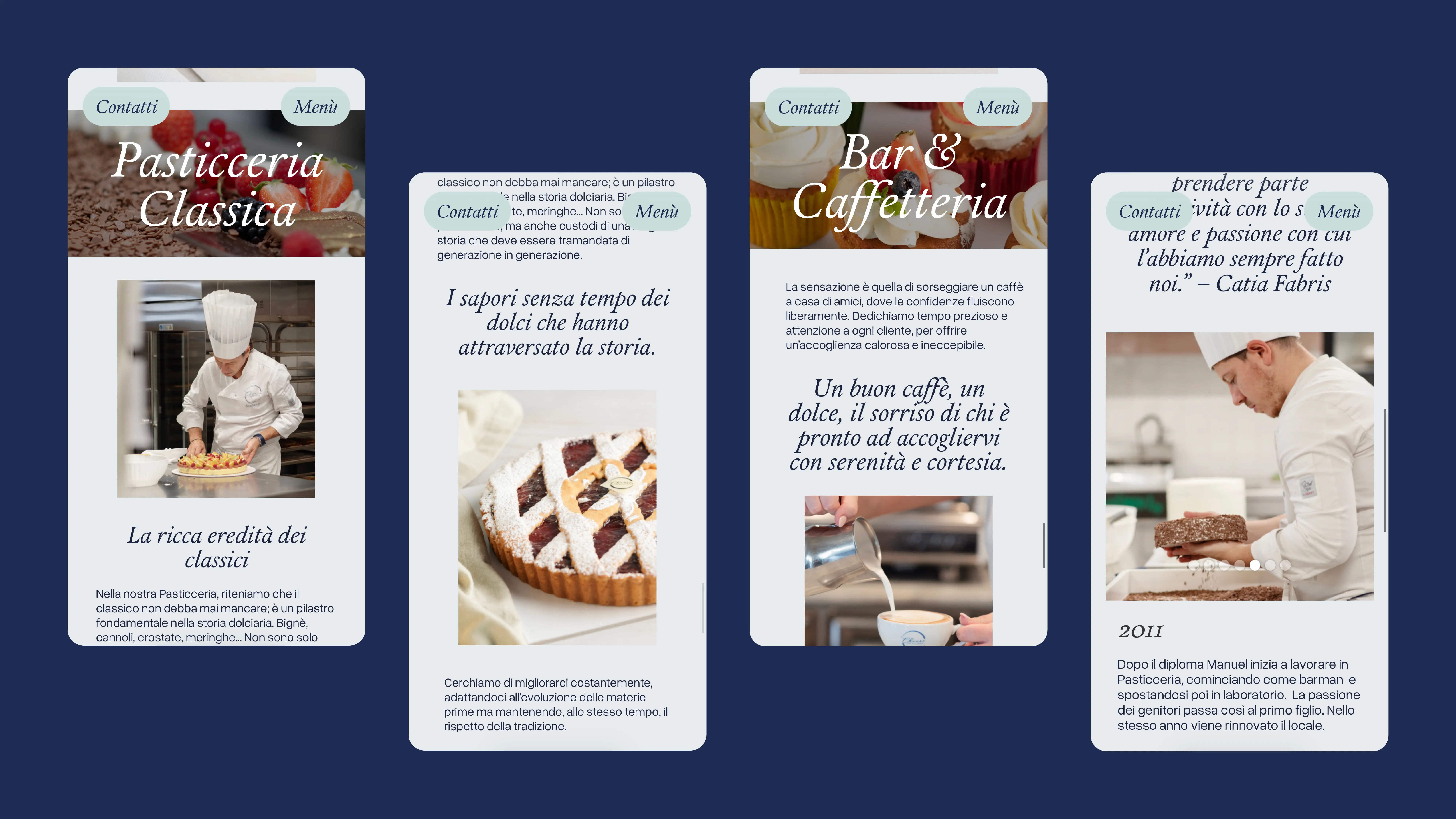 Following the research phase and discussions with the pastry shop’s marketing manager, we structured the website around two main pillars: on one side, a focus on the different types of pastry that Chiaro specializes in, highlighted on the homepage; on the other, a section dedicated to contacts and the brand’s story, which tells the family project that lies at the core of the business.